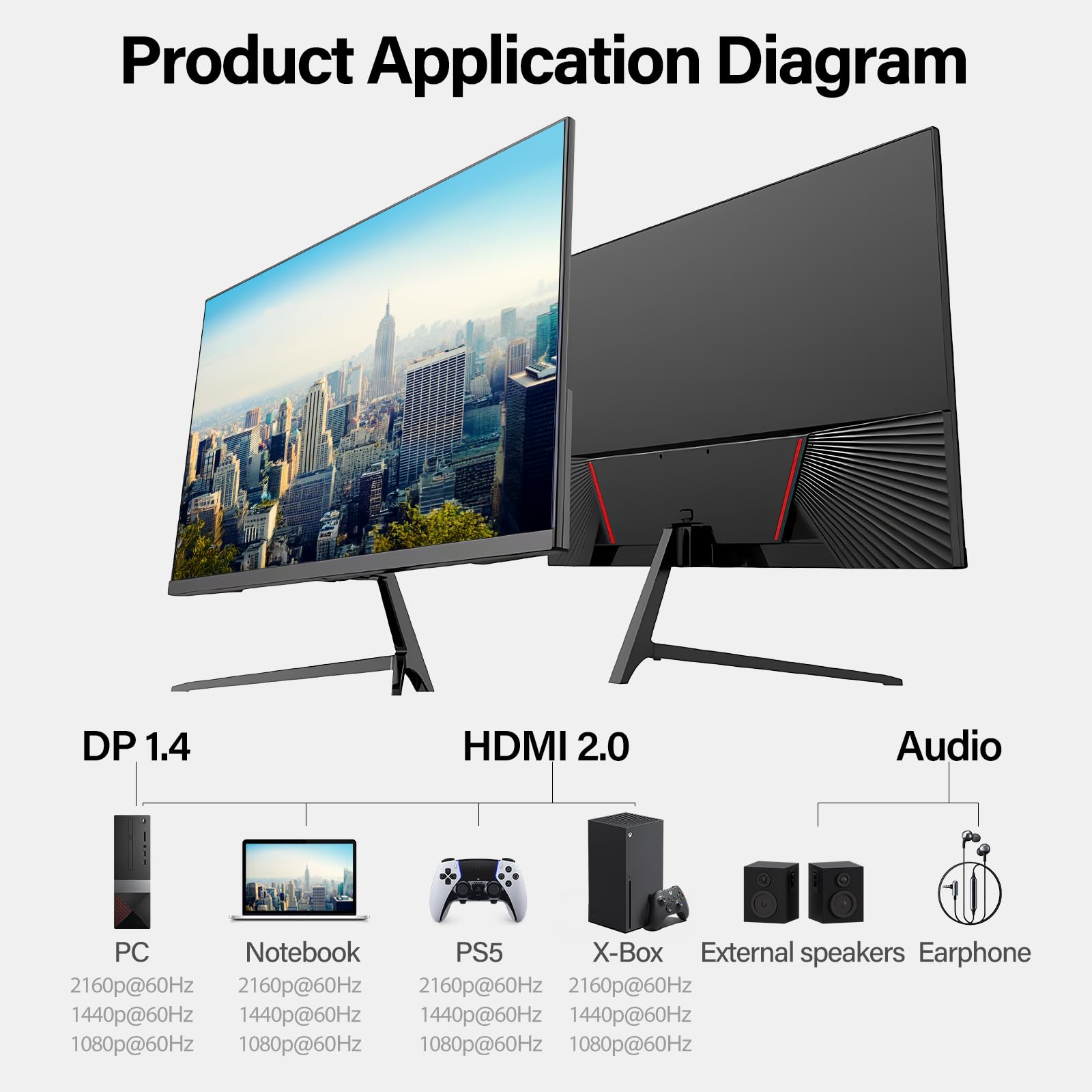 Gawfolk 4K IPS 27 Zoll Monitor 60Hz, PC Bildschirm UHD 3840 x 2160p Rahmenloses Computerbildschirm für Home Office Business, DP, HDMI, VESA 75 * 75MM