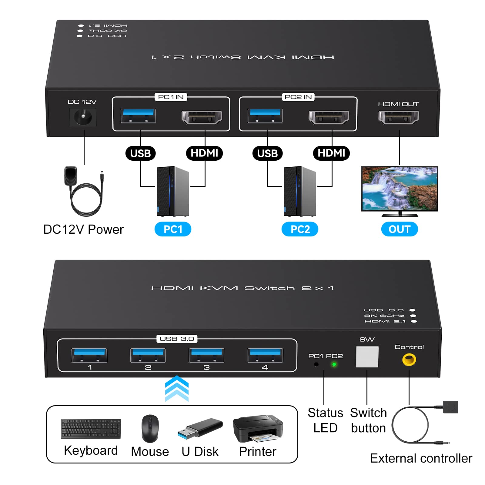 - 【KVM Switch 2 PC 1 Monitore】Der KVM switches unterstützt 2 Computer, die sich einen HD-Monitor und 4 USB 3.0-Geräte teilen, so dass Sie einen Drucker, Scanner, USB-Stick oder ein anderes USB-Gerät an den KVM anschließen können. (Hinweis: Bitte verwenden Sie ein Ultra-High-Speed-HDMI-Kabel für ein besseres 8K 60Hz-Erlebnis)