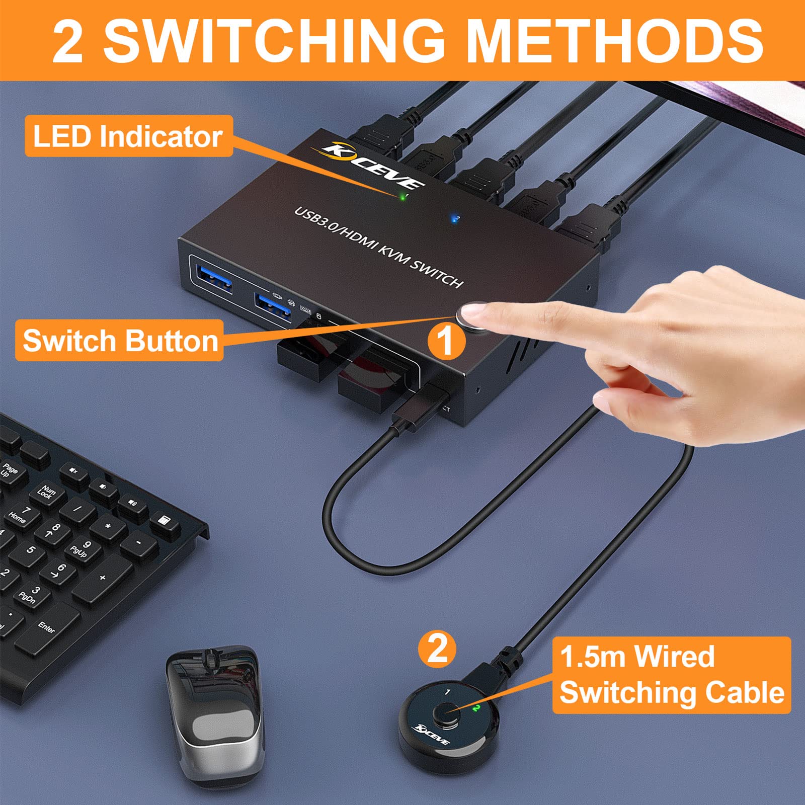 - 【KVM Switch HDMI mit 2 Schaltmodi】Plug and play, Keine zusätzliche Treibersoftware erforderlich. Drücken Sie die Umschalttaste des KVM Switch 2 PC oder der 1,5 m langen Kabelfernbedienung, um einfach zwischen 2 Computern auf 1 Monitor zu wechseln. LED-Anzeigen zur Unterscheidung aktiver Computer. KVM Switch 2 PC 1 Monitor HDMI verbessern die Effizienz im Büro und halten den Schreibtisch aufgeräumt