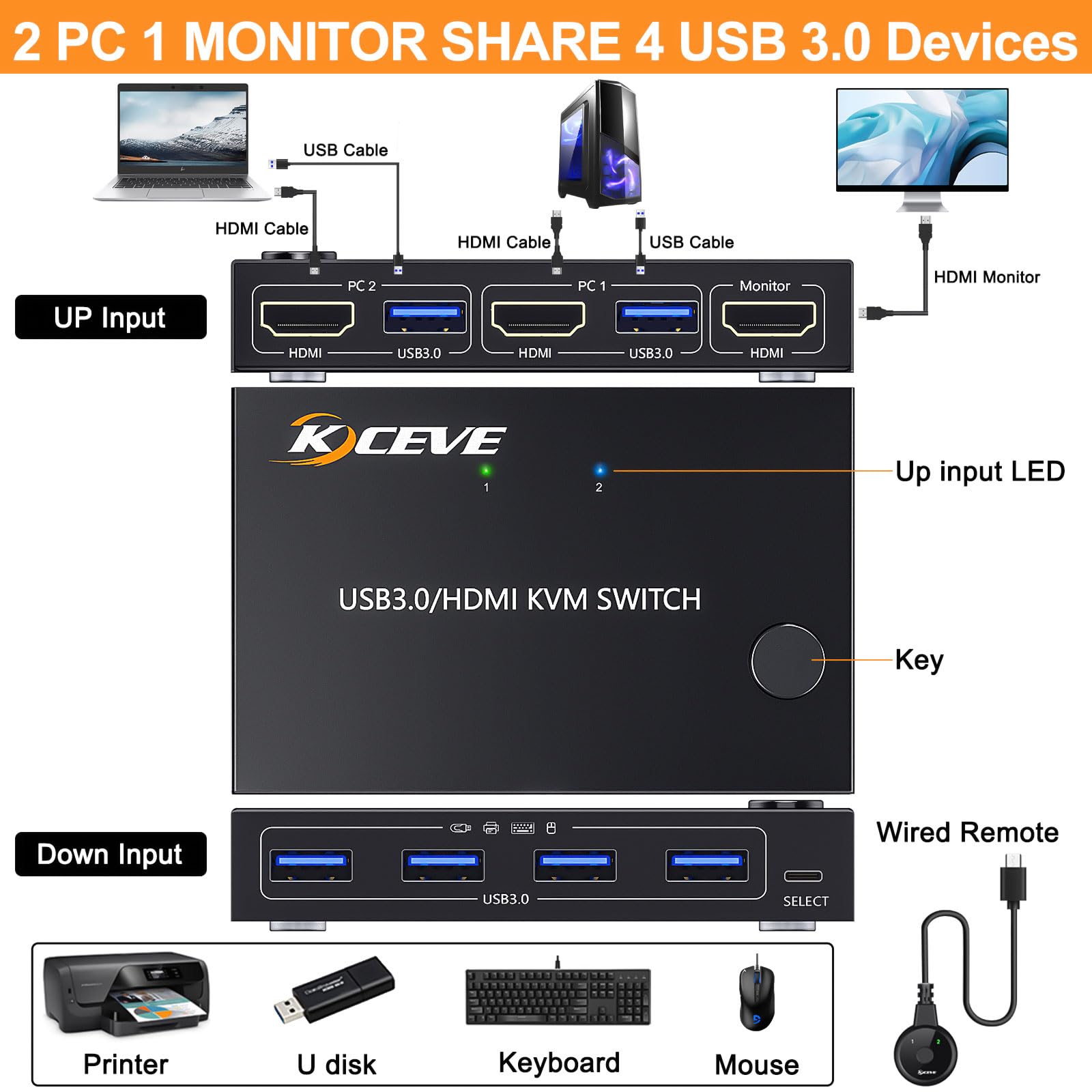 - 【HDMI KVM Switch 2 PC 1 Monitor Teilen 4 USB 3.0 Geräte】Dieser KVM Switch HDMI 2 Port kann 2 Computer Eingänge 1 Display Ausgang realisieren, bis zu 4 USB 3.0 Geräte anschließen. Der HDMI und USB switch ermöglicht es 2 PC, 1 Monitor zu teilen, gesteuert durch eine Reihe von kabelgebundenen / drahtlosen Maus und Tastatur, unterstützt auch Drucker, Scanner, Webcam. Unterstützt USB 3.0 Geräte mit bis zu 5Gbps ultraschneller Übertragungsrate, 10 mal schneller als USB 2.0