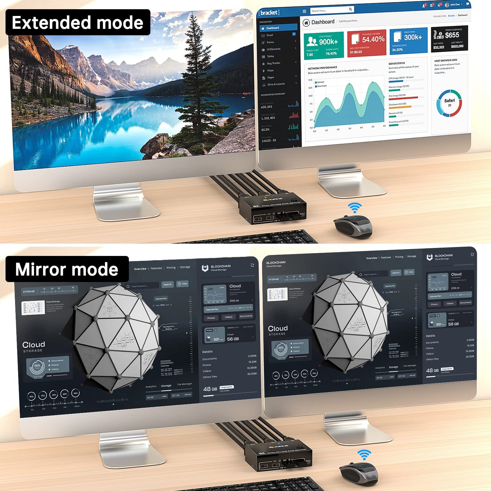 - 【KVM Switch Displayport 2 PC 2 Monitore】Mit diesem 2 PC 2 Monitor Displayport KVM Switch können Sie 2 Computer mit nur einem Satz von Bedienelementen (Monitor, kabellose Maus, Tastatur, Drucker) steuern, Webcams unterstützen. Sie können zwischen den beiden Anzeigen frei wechseln. Drücken Sie Windows+P, um den Spiegelmodus oder den erweiterten Bildschirmmodus auszuwählen. Jeder PC benötigt 2 Displayport-Kabel + 1 USB-Kabel, die gleichzeitig in kvm-switches eingesteckt sind